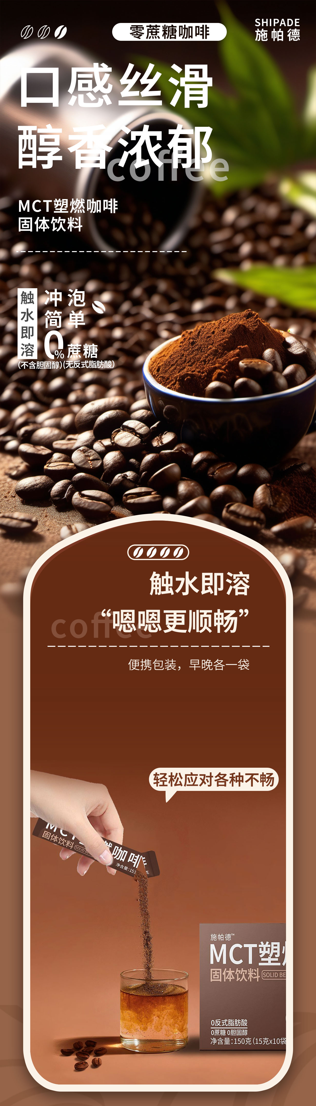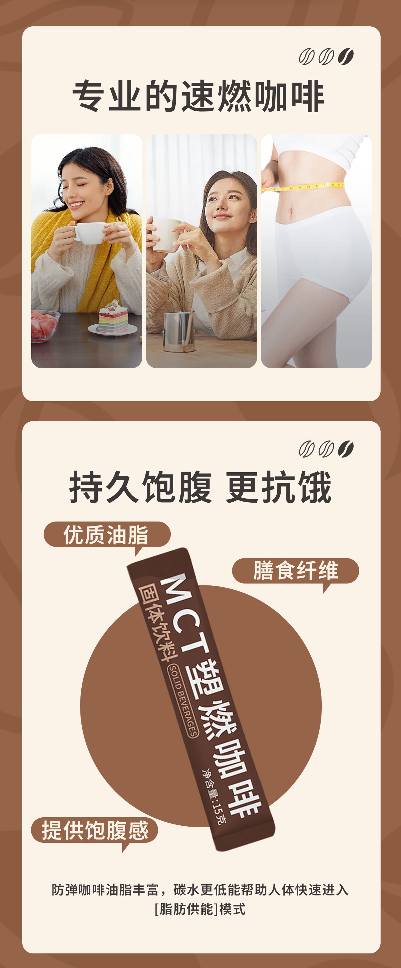 3、对健康可能存在其他益处:有研究表明,MCT 还有助于改善肠道代谢健康。 市场上有多种品牌的 MCT 塑燃咖啡固体饮料,不同产品的具体成分、配方、功效宣称可能会有所差异。一些人在饮用后可能会感觉到有一定的饱腹感,或者认为在配合运动等情况下对减肥有一定的帮助。然而,其效果可能因个体差异而有所不同,且不能单纯依赖此类产品来实现减肥目标。 在使用这类产品时,还需要注意以下几点: 产品质量和安全性:要选择正规渠道购买,确保产品质量可靠,避免购买到假冒伪劣或含有不良成分的产品。